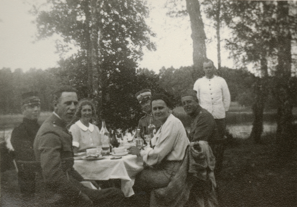 Text i fotoalbum: "Sommarmarschen 1937 till Varnum (norr Ulricehamn). P*, Peter v. E., Frih:an P*, Hinke Lager, Philipsson, Frih:an v. E. Kräftsupé i Varnumlägret".