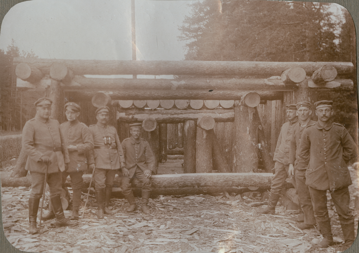 Text i fotoalbum: "Sommaren 1916. Virket och ramarna till ett bombsäkert skyddsrum sammansättas bakom fronten"