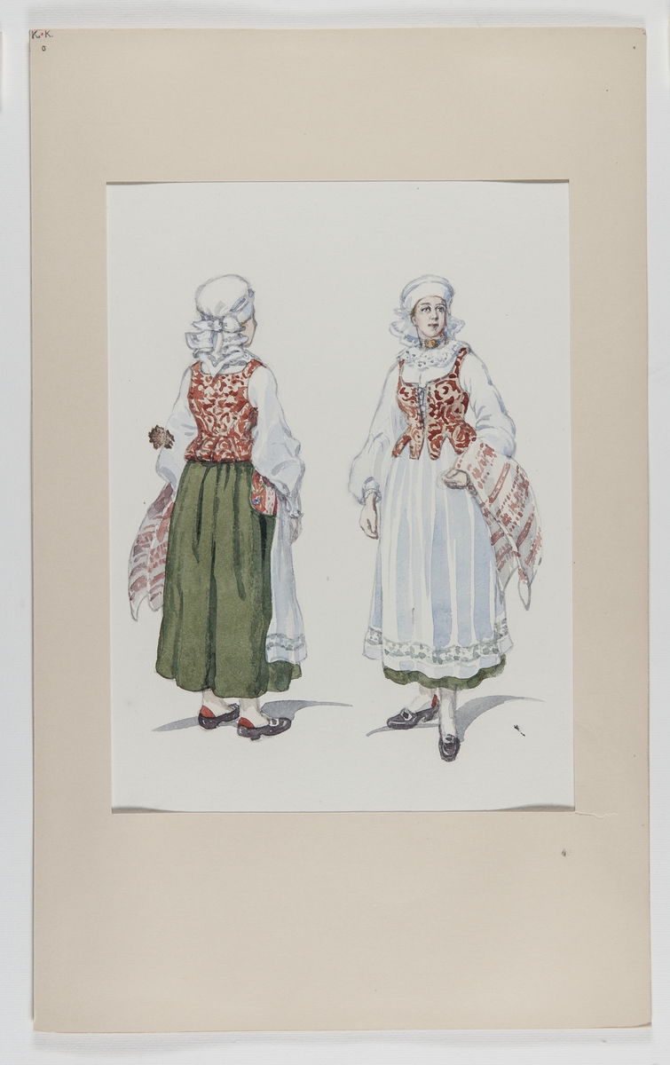 Högtidsdräkt, kvinnodräkt, Gotland. Teckning av Emelie von Walterstorff.
