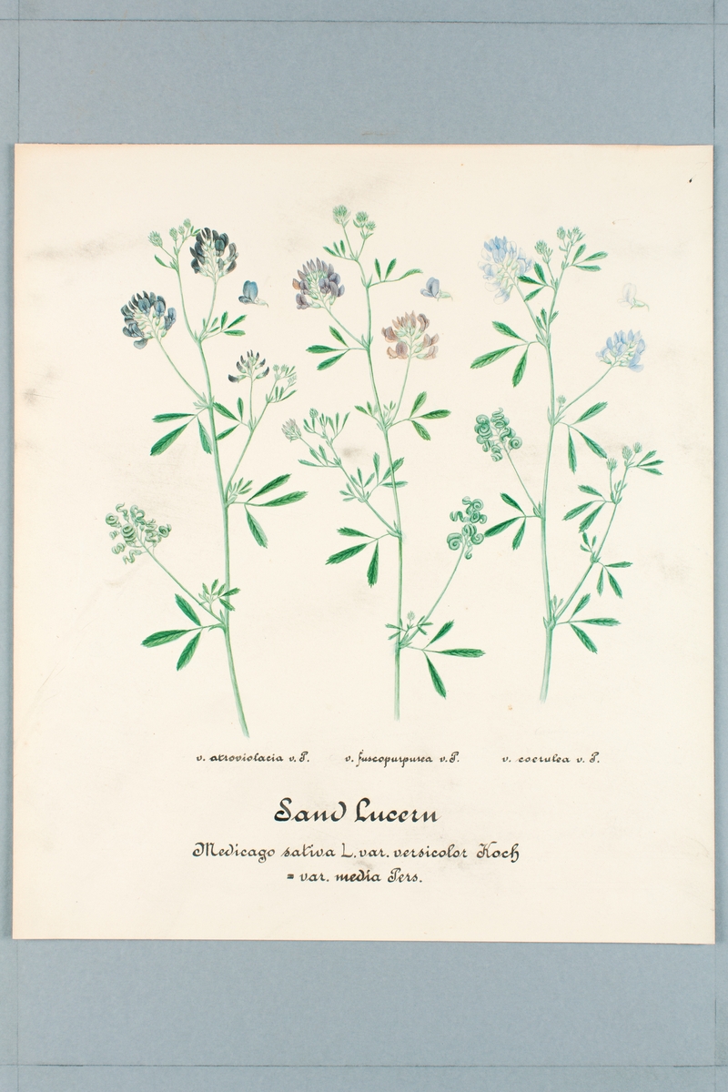 Sveriges kulturväxter. Illustration utförd av Henriette Sjöberg. Sandluzern (Sand Lucern påskrift), tre varieteter. Odlad Ultuna 1875. Troligen fortsättning på NMA.0098349.