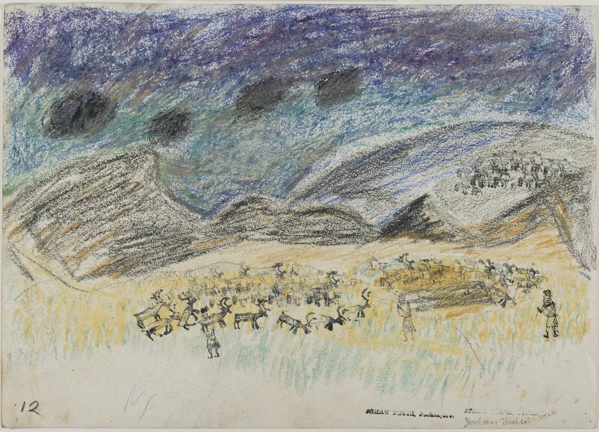 Teckning av Johan Turi. Krita. Fjällandskap med renar och människor.