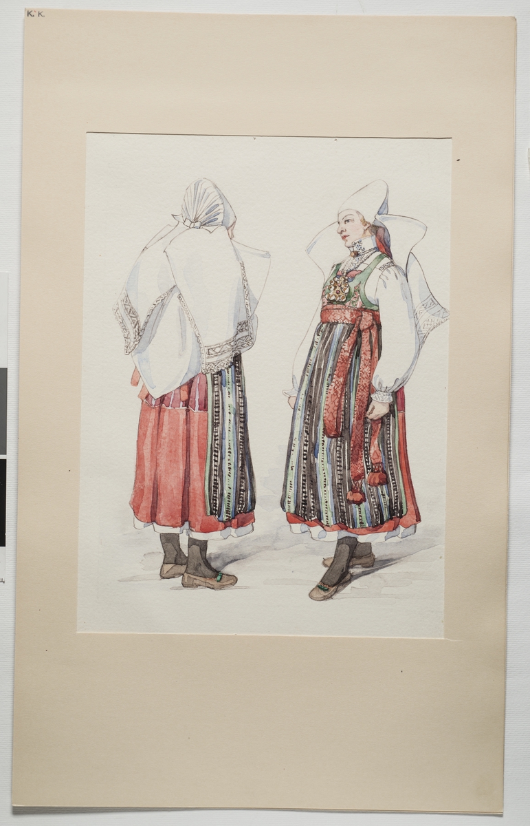 Festdräkt för gift kvinna Ljunits härad, Skåne. Akvarell av Emelie von Walterstorff.