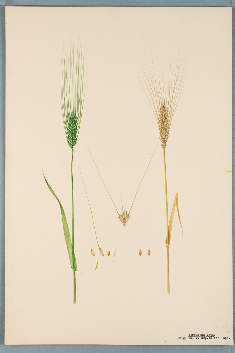 Sveriges kulturväxter. Illustration utförd av Henriette Sjöberg. Vete, Sorentino. Odlat Experimentalfältet 1891. Inv. nr. C101 : 94. Signerad "H.S. Exper. 1891.".