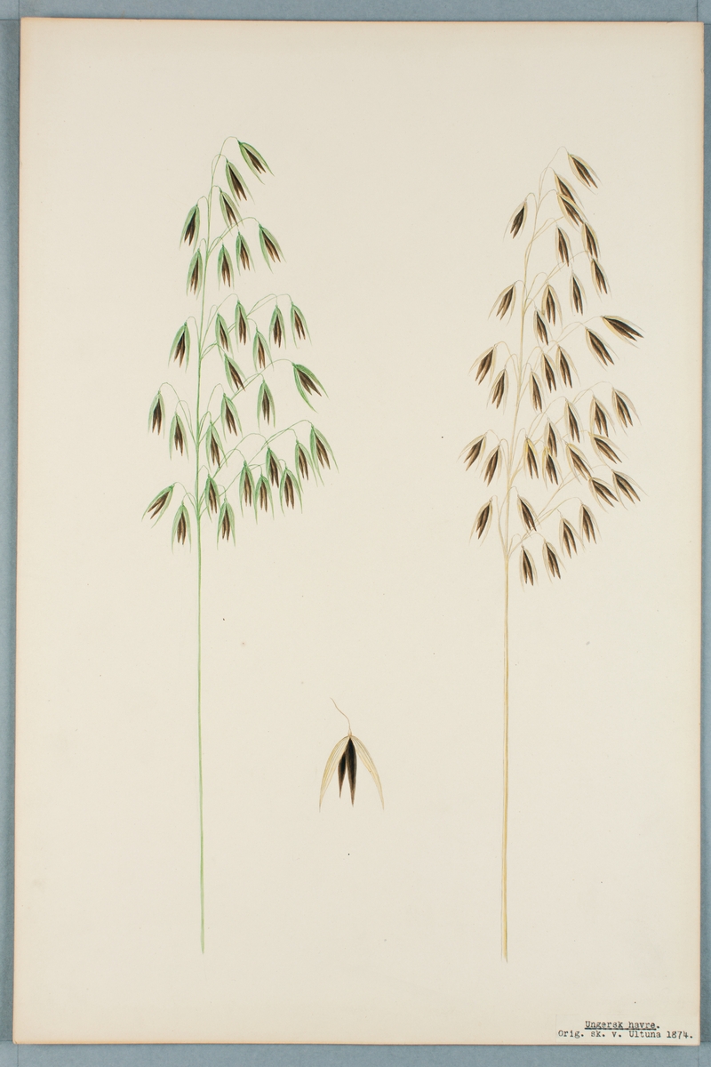 Sveriges kulturväxter. Illustration utförd av Henriette Sjöberg. Ungersk havre. Odlad Ultuna 1874. Inv. nr. C101 : 211.