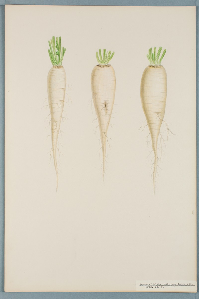 Sveriges kulturväxter. Illustration utförd av Henriette Sjöberg. Rättika, lång, vit. Odlingsplats och datering saknas. Inv. nr. C101 : 398.