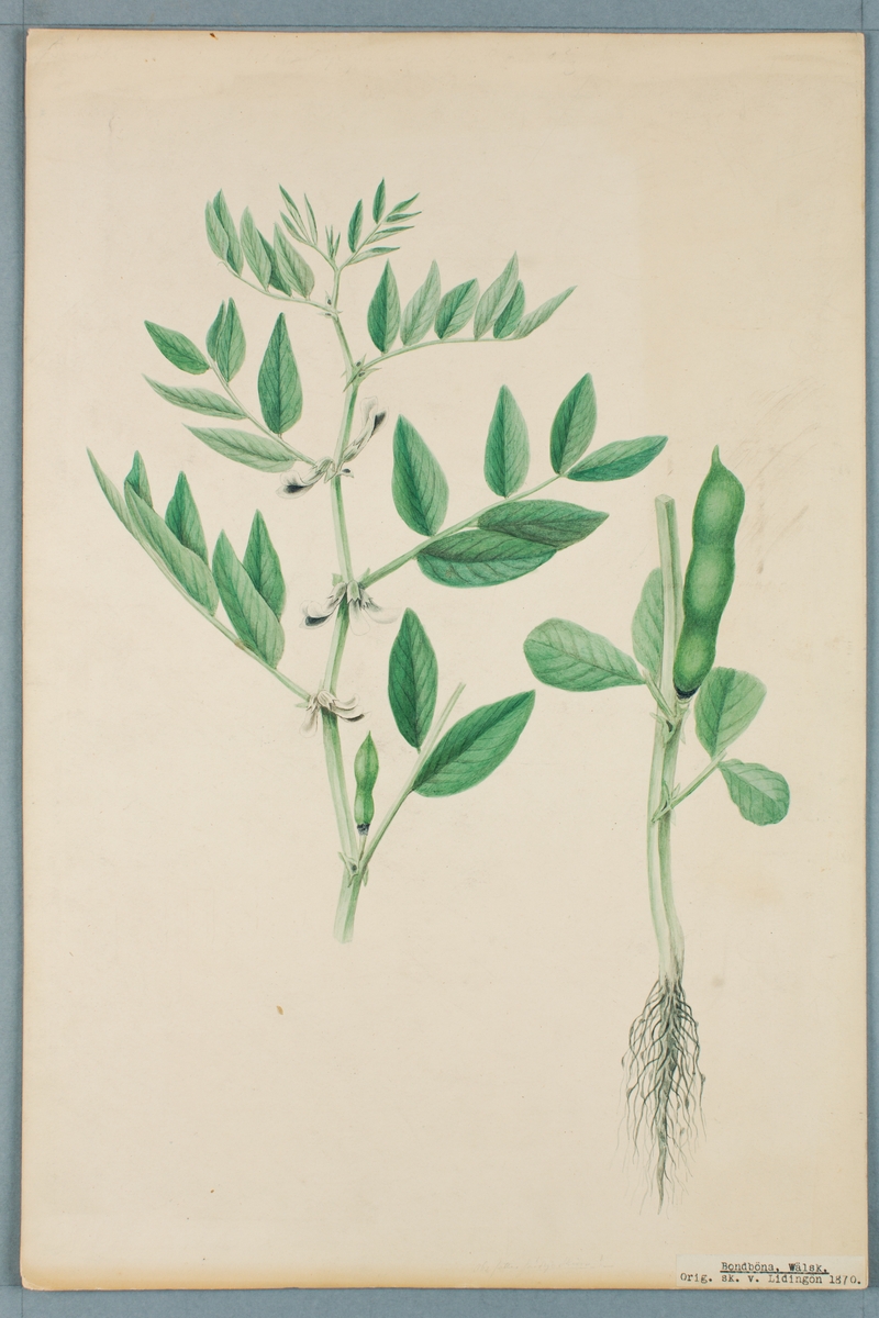 Sveriges kulturväxter. Illustration utförd av Henriette Sjöberg. Böna, Wälsk. Odlad Lidingö 1870. Inv. nr. C101 : 445.