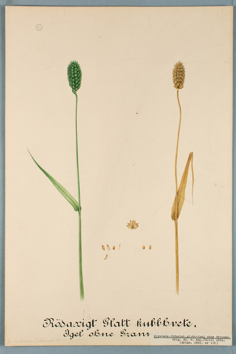 Sveriges kulturväxter. Illustration utförd av Henriette Sjöberg. Vete, kubbvete, rödaxigt, glatt (Igel ohne Grannen). Odlat Experimentalfältet 1891. Eriksson 1892, nr. 107. Inv. nr. C101 : 119. Signerad "H.S. Exper. 1891.".