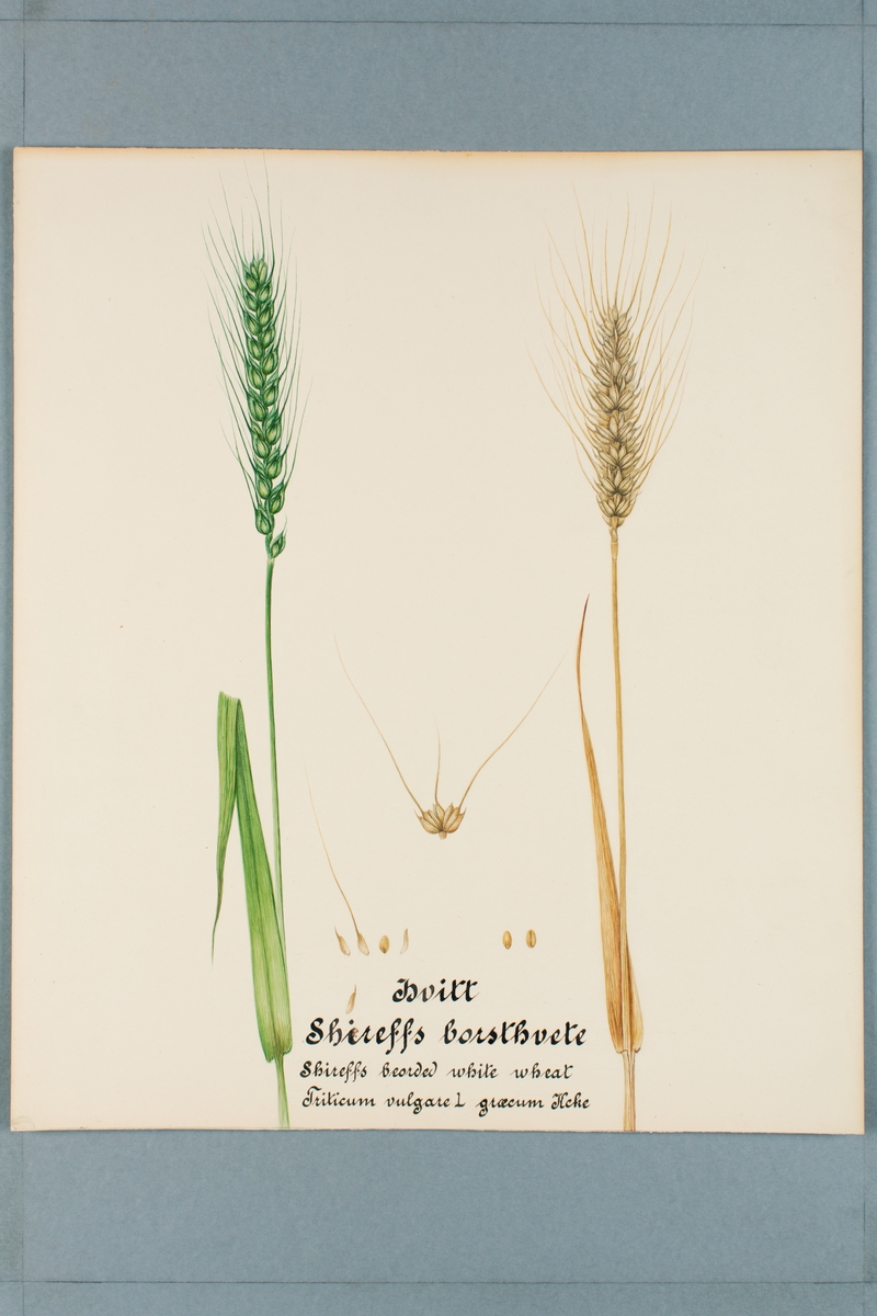 Sveriges kulturväxter. Illustration utförd av Henriette Sjöberg. Vete, Shirreff's bearded white, vitt borstvete. Odlingsplats och datering saknas.