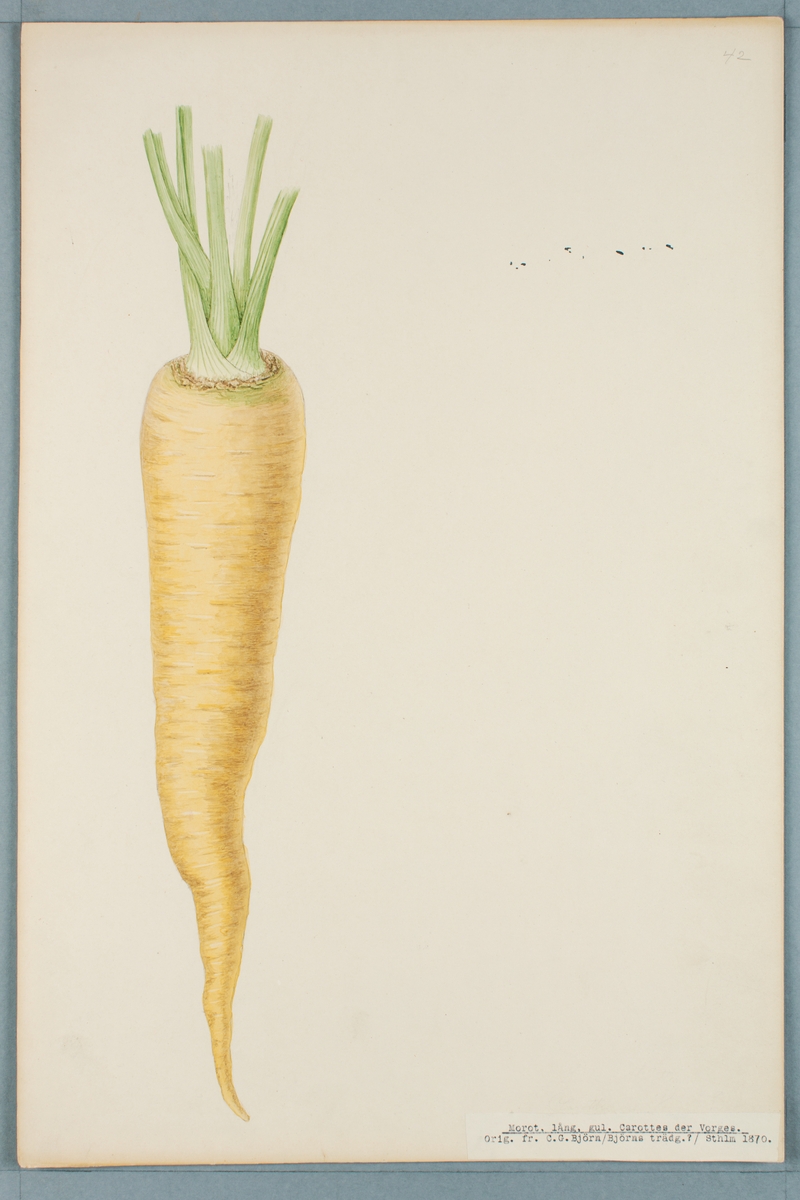 Sveriges kulturväxter. Illustration utförd av Henriette Sjöberg. Morot, lång, gul, Carottes de Vorges. Odlad C. G. Björn, Stockholm 1870. Inv. nr. C101 : 372.