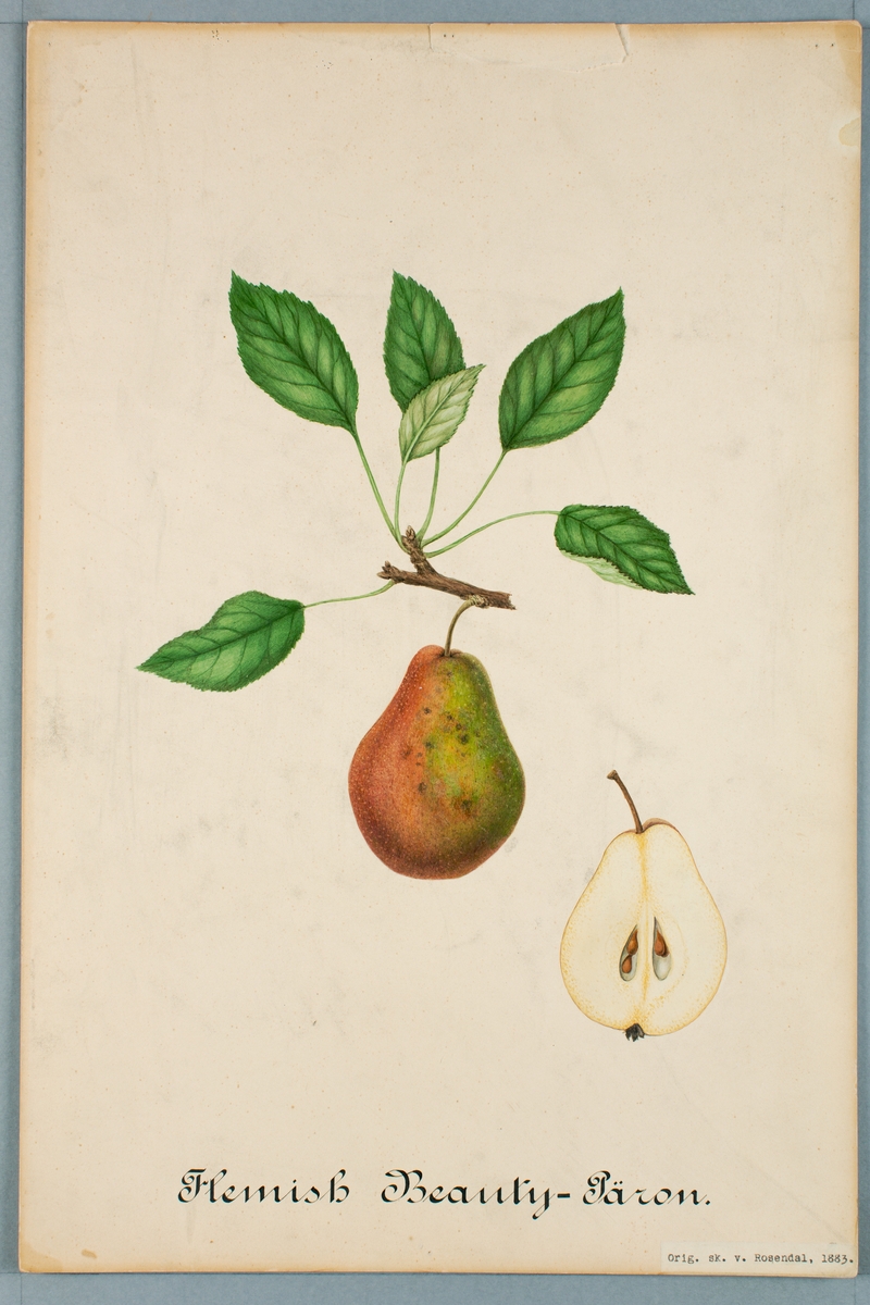 Sveriges kulturväxter. Illustration utförd av Henriette Sjöberg. Päron, Flemish Beauty. Odlat Rosendal 1883. Signerad "H.S. 1883.".