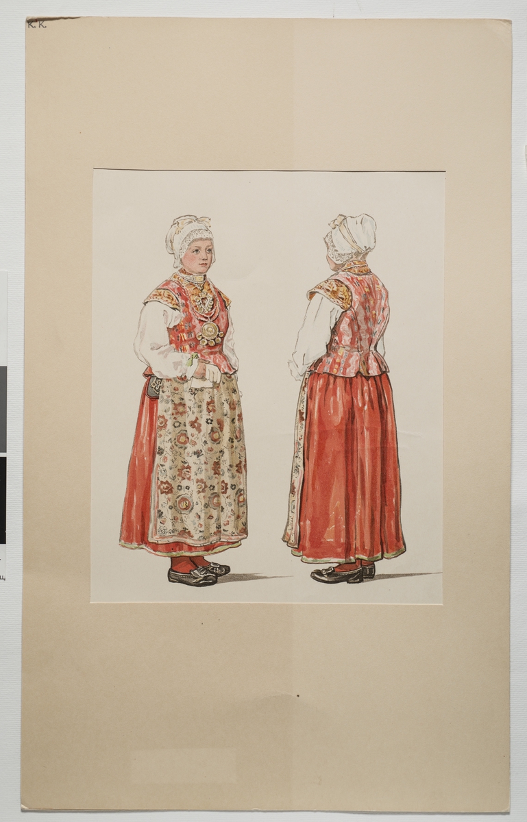 Festdräkt för gift kvinna Unnaryds socken, Småland. Akvarell av Emelie von Walterstorff.