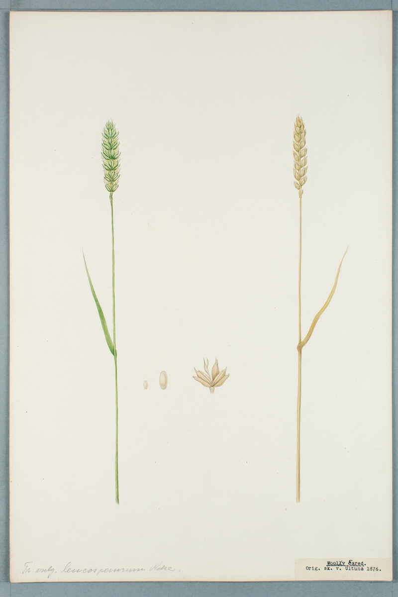 Sveriges kulturväxter. Illustration utförd av Henriette Sjöberg. Vete, Woolly Eard. Odlat Ultuna 1876. Inv. nr. C101 : 115.