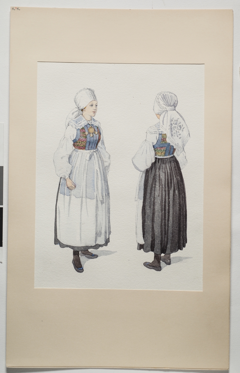 Festdräkt för gift kvinna Onsjö härad, Skåne. Akvarell av Emelie von Walterstorff.