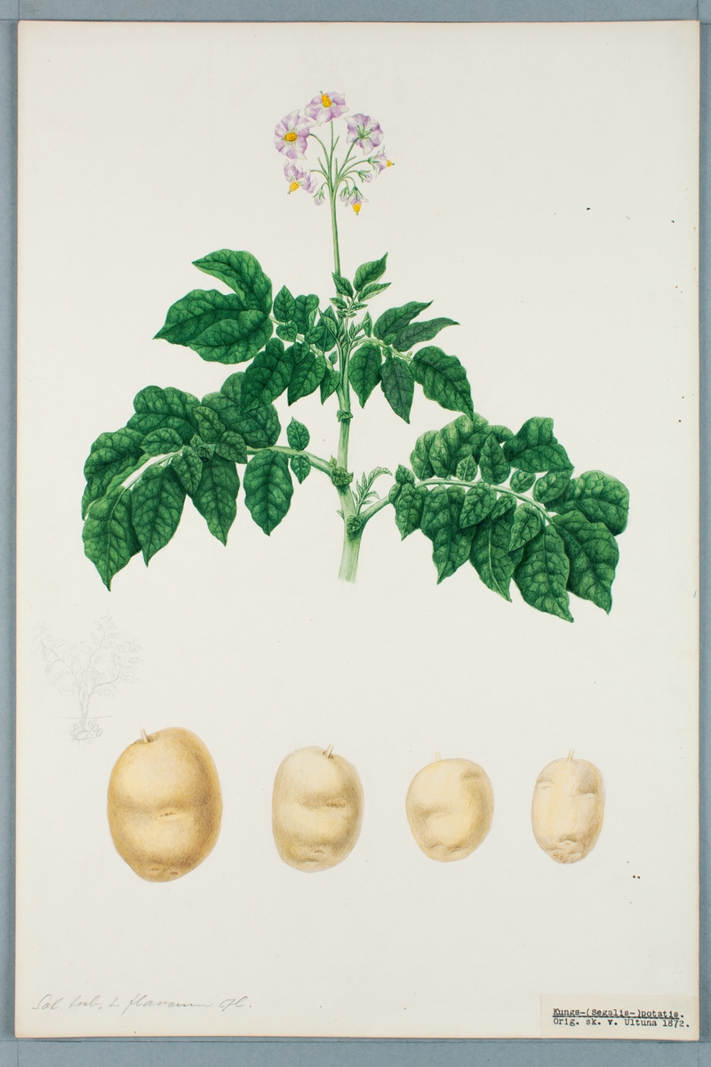 Sveriges kulturväxter. Illustration utförd av Henriette Sjöberg. Kungspotatis (Segalispotatis). Odlad Ultuna 1872. Inv. nr. C101 : 311.