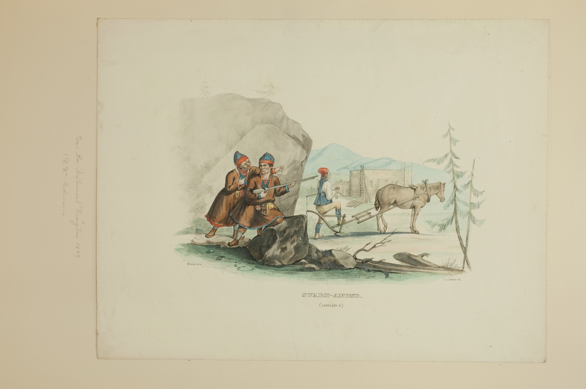 Grafiskt färgtryck. "Swart-Anund." Två män med gevär i bakhåll mot en man som plogar med en häst. Ur Sveriges nationaldrägter/Tecknade av Robert Wilhelm Ekman; jemte skildringar ur folklifvet af Gustaf Henrik Mellin, 1849.