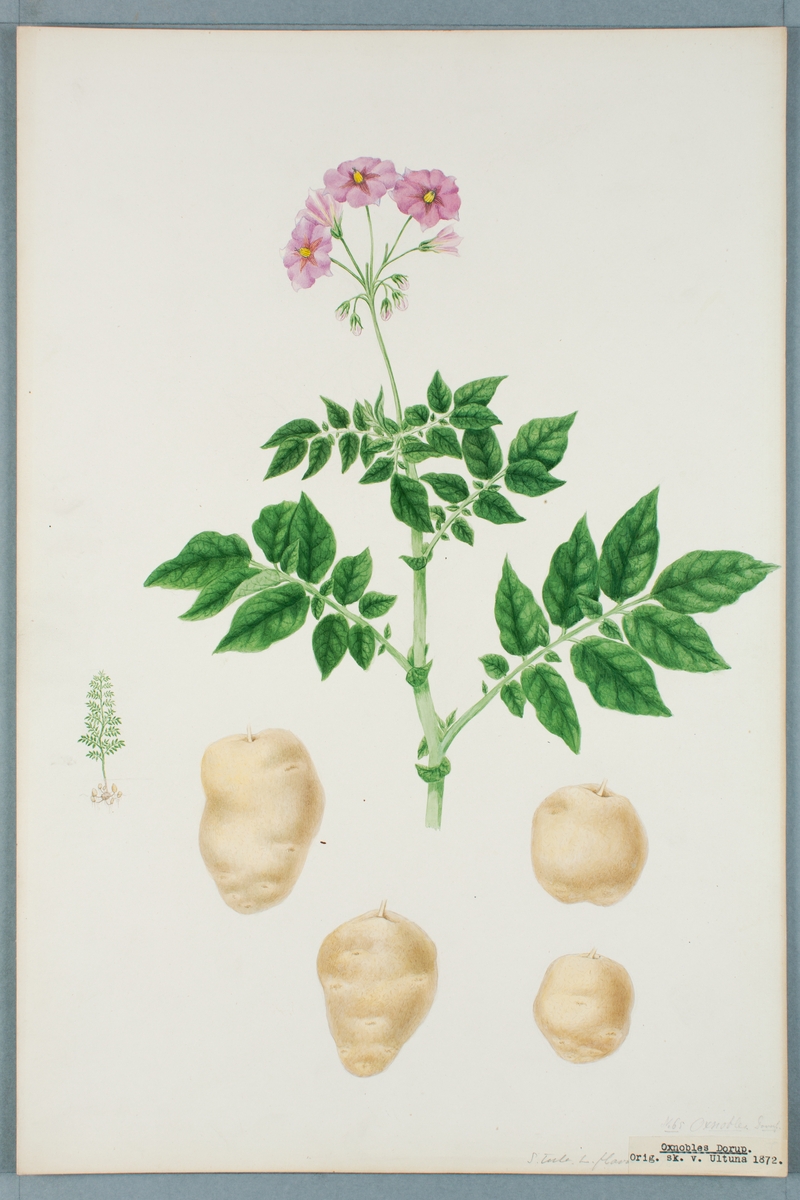 Sveriges kulturväxter. Illustration utförd av Henriette Sjöberg. Potatis, vitgul, Oxnobles Dorup. Odlad Ultuna 1872. Inv. nr. C101 : 310.