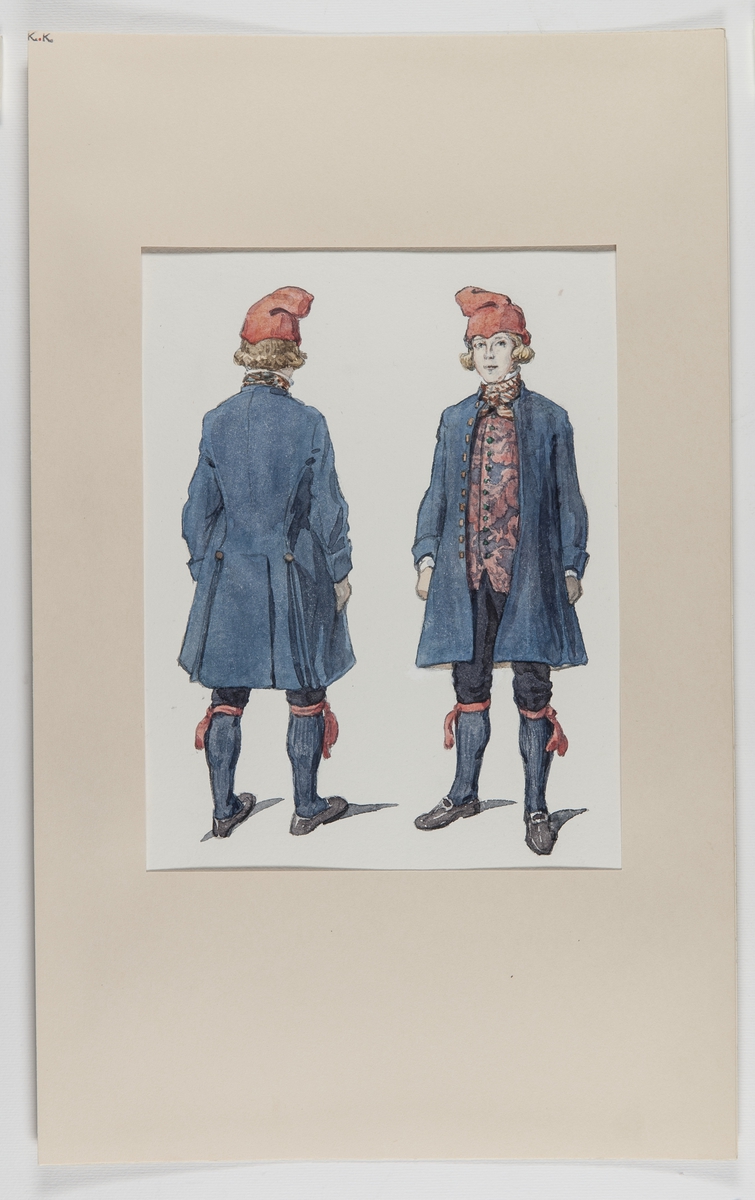 Helgdagsdräkt för män Årstads härad, Halland. Akvarell av Emelie von Walterstorff.