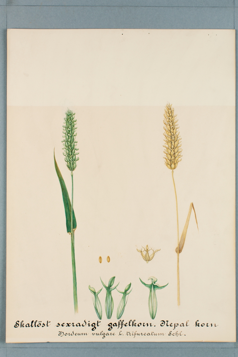 Sveriges kulturväxter. Illustration utförd av Henriette Sjöberg. Korn, Gaffelkorn, skallöst, sexradigt, Nepal korn. Toligen odlat Experimentalfältet 1887. Signerad "Henriette Sjöberg 1887, Exper fält" (delvis otydlig).