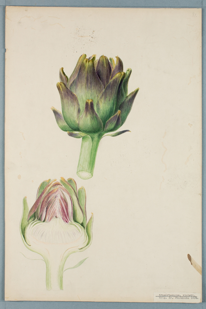 Sveriges kulturväxter. Illustration utförd av Henriette Sjöberg. Kronärtskocka, violett. Odlad Stockholm 1870. Inv. nr. C101 : 414.
