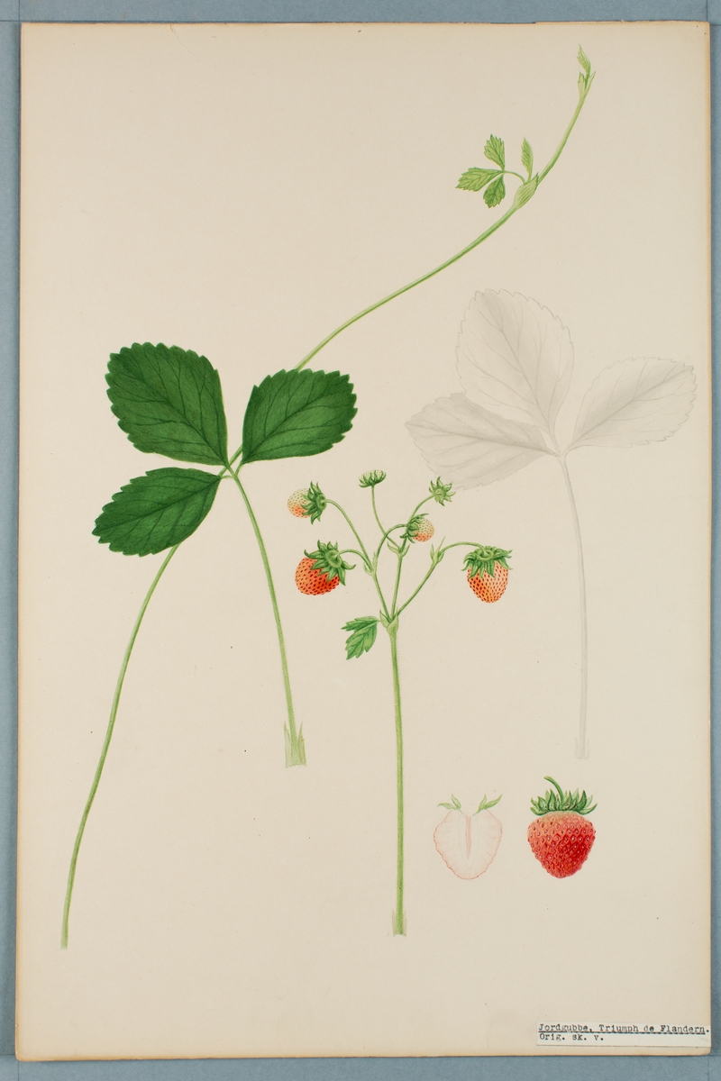 Sveriges kulturväxter. Illustration utförd av Henriette Sjöberg. Jordgubbe, Triumph de Flandern. Odlingsplats och datering saknas. Signerad "H.S.".