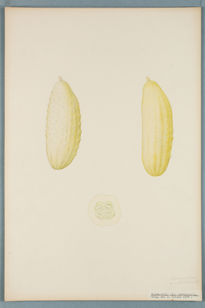 Sveriges kulturväxter. Illustration utförd av Henriette Sjöberg. Gurka, vit, småknottrig. Odlad Ultuna 1878. Inv. nr. C101 : 504.