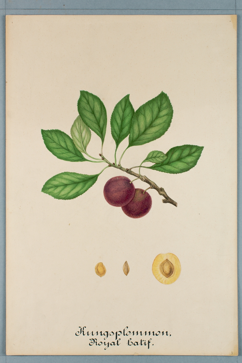 Sveriges kulturväxter. Illustration utförd av Henriette Sjöberg. Plommon, kungsplommon Royala native (påskrift Royal hatif). Odlingsplats och datering saknas. Signerad "1883." (beskuren).