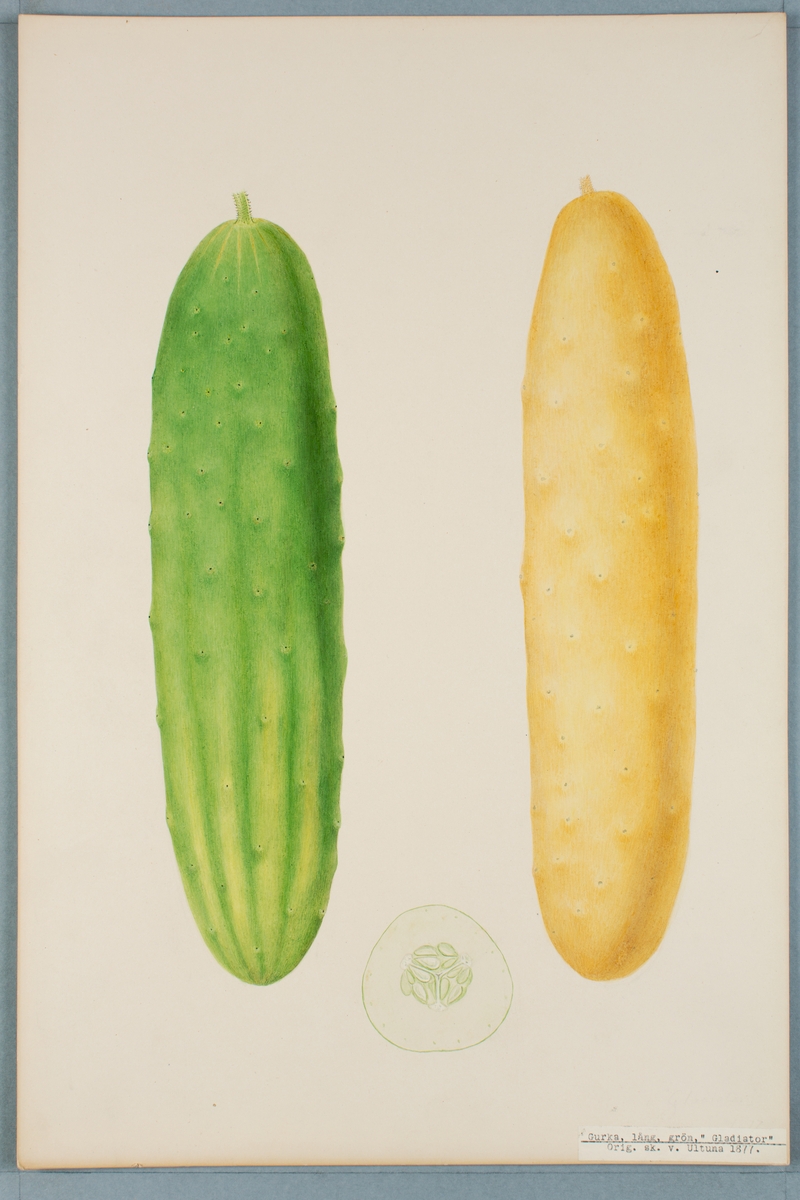 Sveriges kulturväxter. Illustration utförd av Henriette Sjöberg. Gurka, lång, Gladiator. Odlad Ultuna 1877. Inv. nr. C101 : 497.