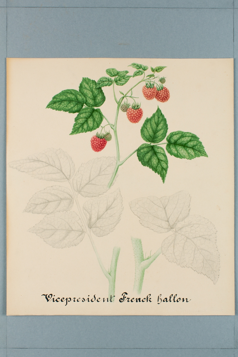 Sveriges kulturväxter. Illustration utförd av Henriette Sjöberg. Hallon, Vicepresident Frenck. Odlad Experimentalfältet 1883.
