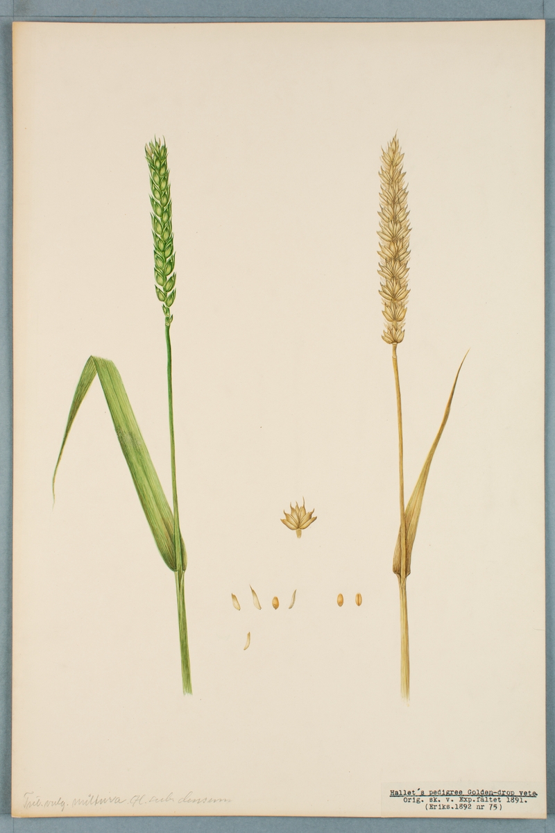 Sveriges kulturväxter. Illustration utförd av Henriette Sjöberg. Vete, Hallet's pedigree Golden-Drop. Odlat Experimentalfältet 1891. Eriksson 1892, nr. 75. Inv. nr. C101 : 52. Signerad "H.S. Exper 1891.". Jämför NMA.0098659.