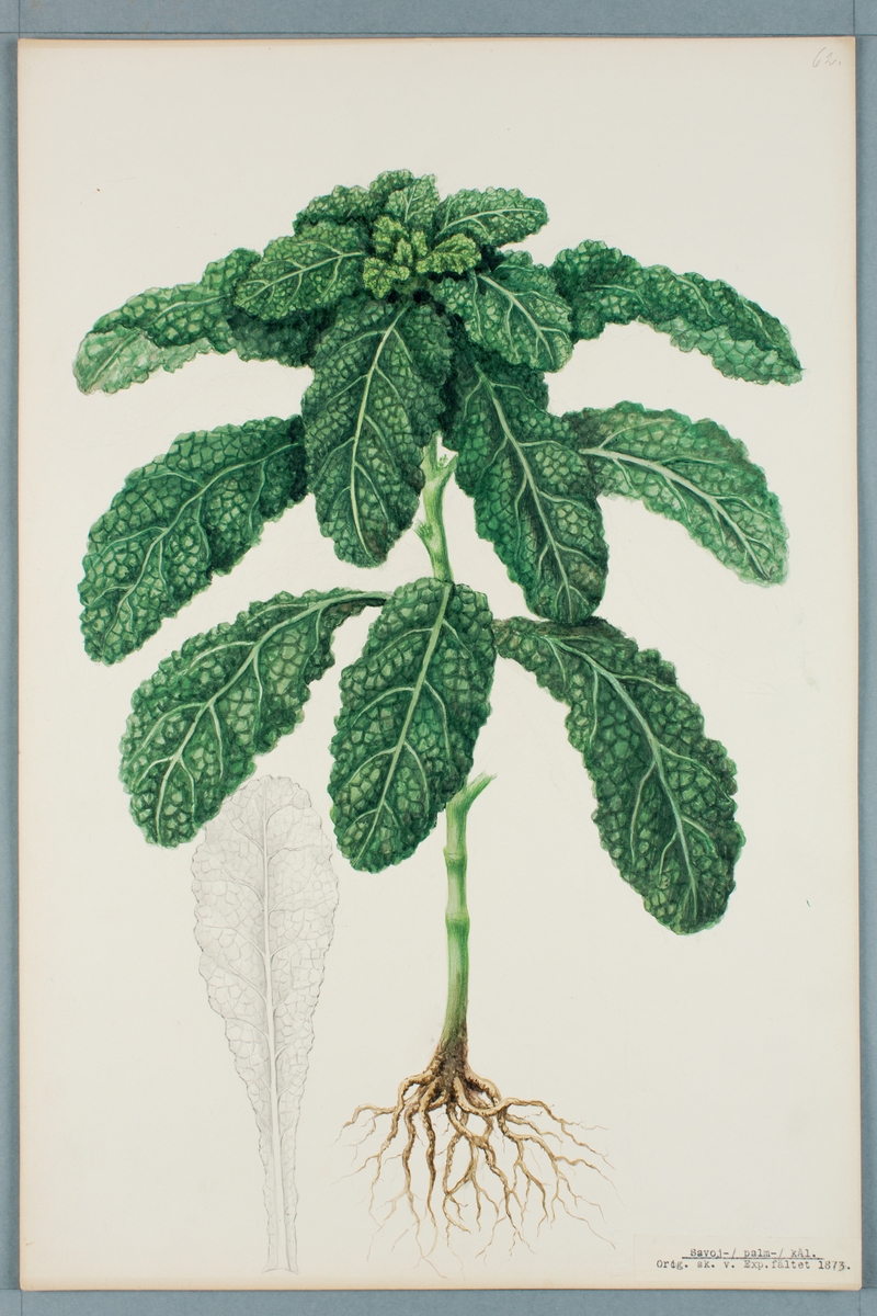 Sveriges kulturväxter. Illustration utförd av Henriette Sjöberg. Savojkål/palmkål. Odlad Experimentalfältet 1873. Inv. nr. C101 : 362.
