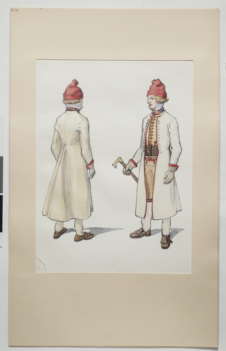 Högtidsdräkt, Delsbo socken, Hälsingland. Akvarell av Emelie von Walterstorff. Mansdräkt.