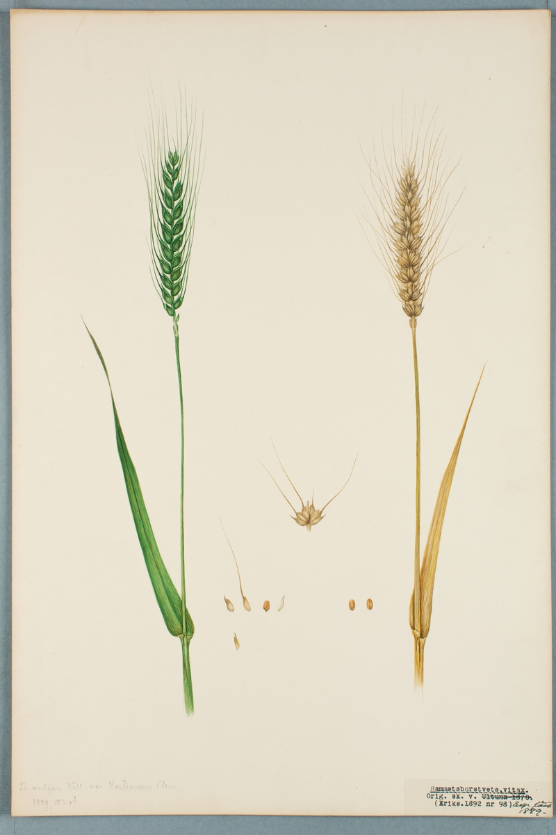 Sveriges kulturväxter. Illustration utförd av Henriette Sjöberg. Vete, Sammetsborstvete, vitaxigt. Odlat Experimentalfältet 1889. Eriksson 1892, nr. 98. Inv. nr. C101 : 86. Signerad "H.S. 1889. Exp.".