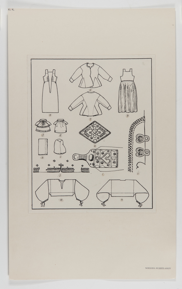 Sommarhögtidsdräkt för ogift kvinna, Orsa socken, Dalarna. Teckning av Emelie von Walterstorff.