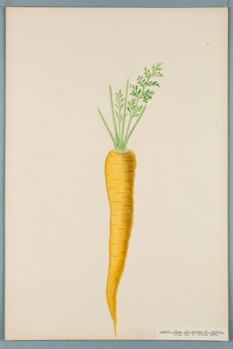 Sveriges kulturväxter. Illustration utförd av Henriette Sjöberg. Morot, lång, gul, Lobber fr Erfurt. Odlad Ultuna 1875. Inv. nr. C101 : 373.