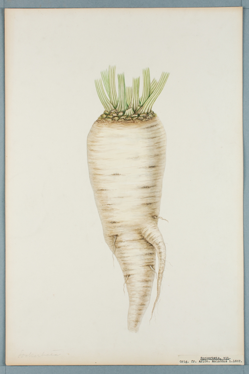 Sveriges kulturväxter. Illustration utförd av Henriette Sjöberg. Sockerbeta, vit. Odlad Arlöv, Skåne 1882. Inv. nr. C101 : 252. Signerad "H.S. 1883.".