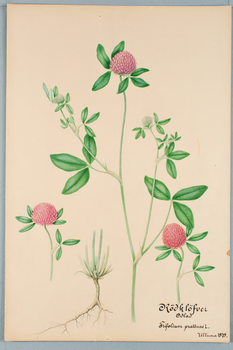 Sveriges kulturväxter. Illustration utförd av Henriette Sjöberg. Rödklöver. Odlad Ultuna 1879. Signerad "H.S. 79.".