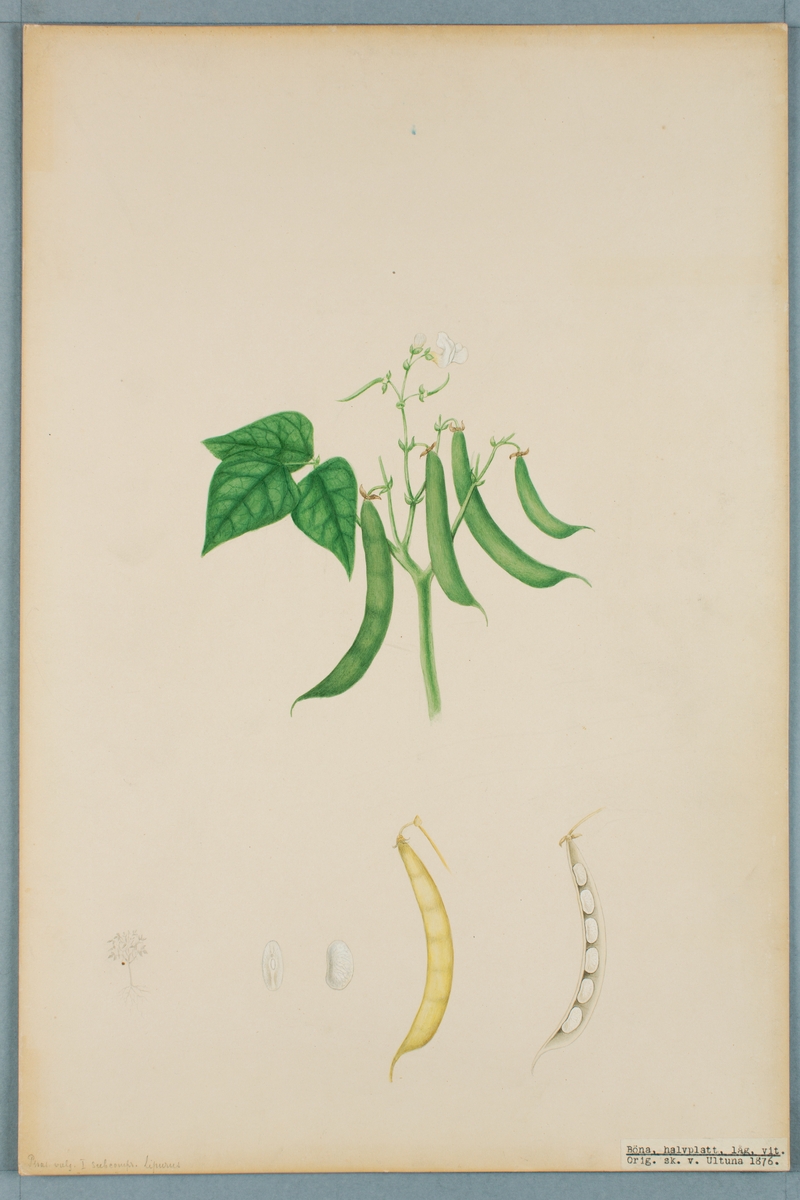 Sveriges kulturväxter. Illustration utförd av Henriette Sjöberg. Böna, halvplatt låg, vit. Odlad Ultuna 1876. Inv. nr. C101 : 485.
