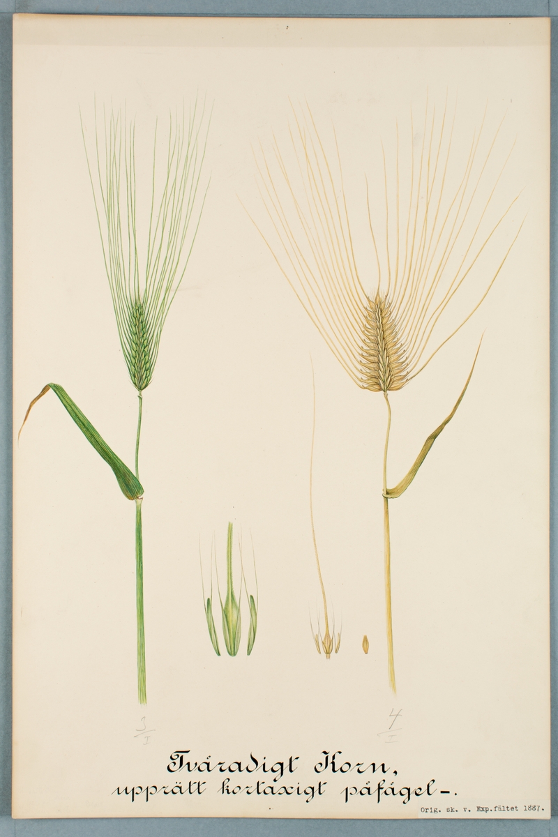 Sveriges kulturväxter. Illustration utförd av Henriette Sjöberg. Korn, tvåradigt, upprätt, kortaxigt, Påfågelskorn. Odlat Experimentalfältet 1887. B. Signerad "Henriette S.g 1887 Exper fälte".