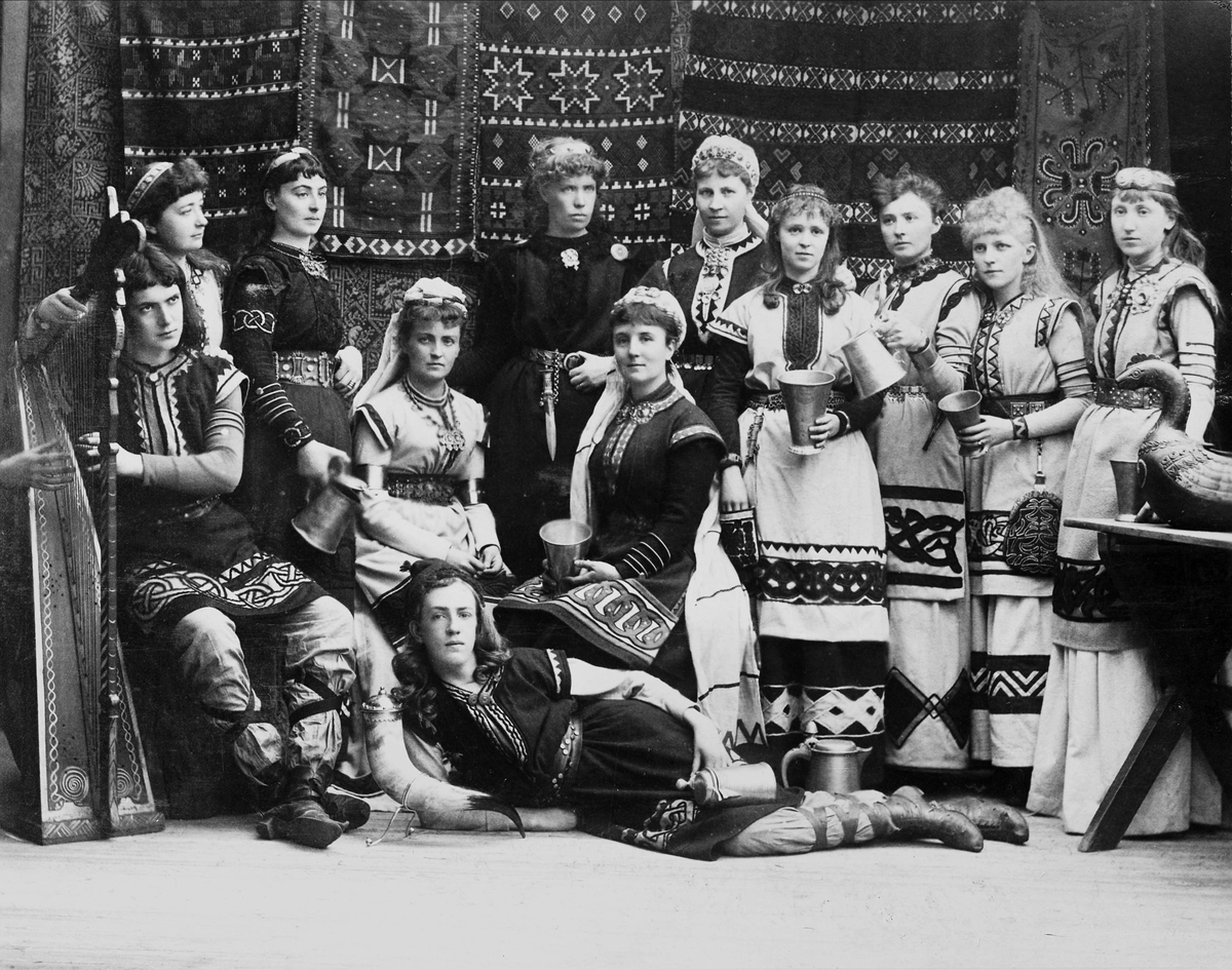 Basar i Stockholms börshus 1885 till förmån för Artur Hazelius och Nordiska museet. Deltagarna är klädda i fornnordiska dräkter kompomnerade av Hanna Winge i starka färger och med drakslingor och geometriska mönsterbårder. Bland deltagarna var Calla Curmann, som satt i ledningen för det nyligen bildade Handarbetets vänner, i vars ateljé dräkterna tillverkats. Övriga kvinnor i gruppen var bland andra Ann-Charlotte Edgren Leffler, Sonya Kovalevsky, Signe Mittag-Leffler, Anna Scholander, Ellen Key och Alfhild Agrell.