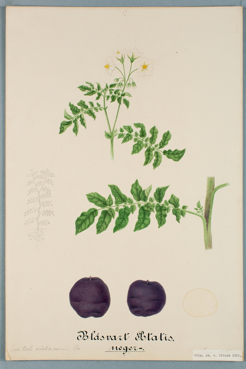 Sveriges kulturväxter. Illustration utförd av Henriette Sjöberg. Potatis, blåsvart, Negerpotatis. Odlad Ultuna 1877. Inv. nr. C101 : 340.