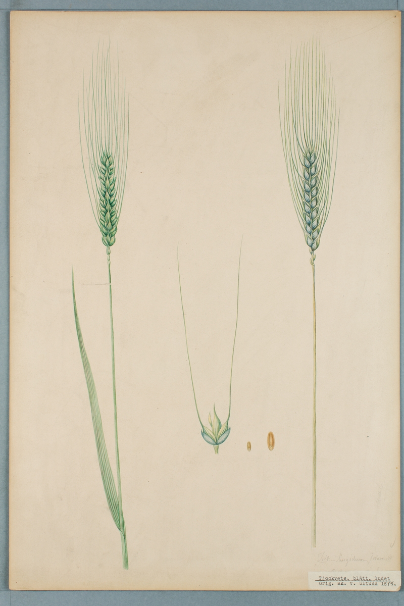 Sveriges kulturväxter. Illustration utförd av Henriette Sjöberg. Vete, Tjockvete, blåaxigt, ludet. Odlat Ultuna 1875. Inv. nr. C101 : 103.
