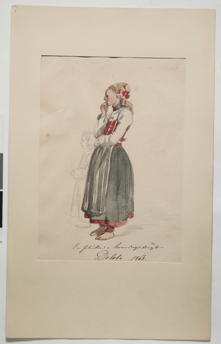 En flicka i hvardagsdrägt har på sig en överdel, livstycke, förkläde, kjol, bindmössa och strumpskaft eller benholkar. Bredvid henne finns en mindre flicka skissad i blyerts.