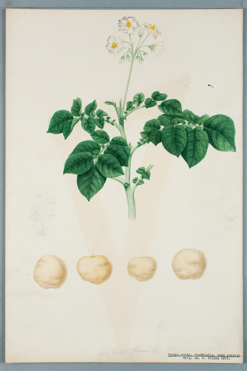 Sveriges kulturväxter. Illustration utförd av Henriette Sjöberg. Potatis, vitgul, Rundbladig. Odlad Ultuna 1872. Inv. nr. C101 : 313.