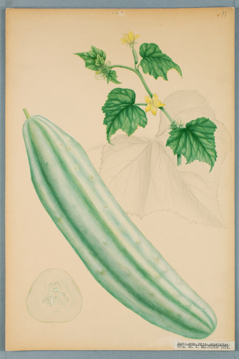 Sveriges kulturväxter. Illustration utförd av Henriette Sjöberg. Gurka, lång, Armstädter, jättegurka. Odlad Experimentalfältet 1873. Inv. nr. C101 : 494.