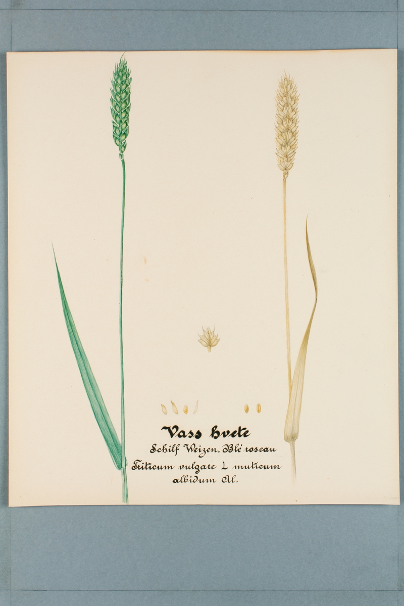 Sveriges kulturväxter. Illustration utförd av Henriette Sjöberg. Vete, Vassvete, Schilf Weizen/Blé Roseau. Odlingsplats och datering saknas.