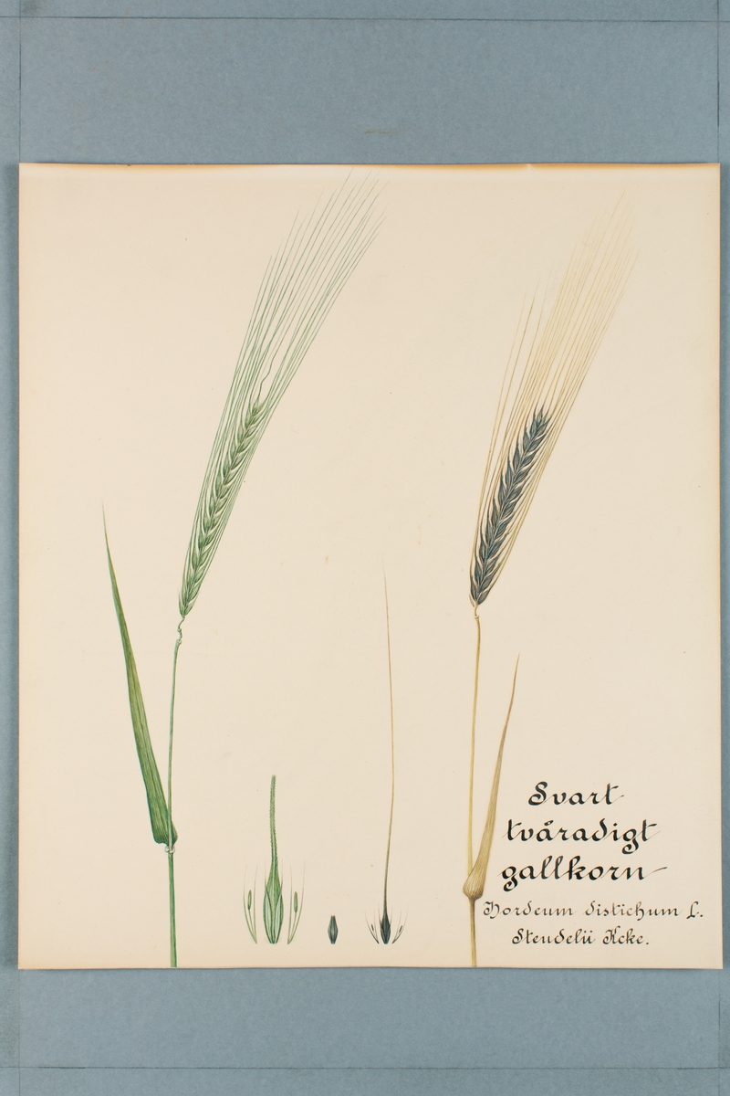 Sveriges kulturväxter. Illustration utförd av Henriette Sjöberg. Korn, Gallkorn, svart, tvåradigt. Odlat Experimentalfältet (uppgift om detta saknas dock på arket), datering saknas.
