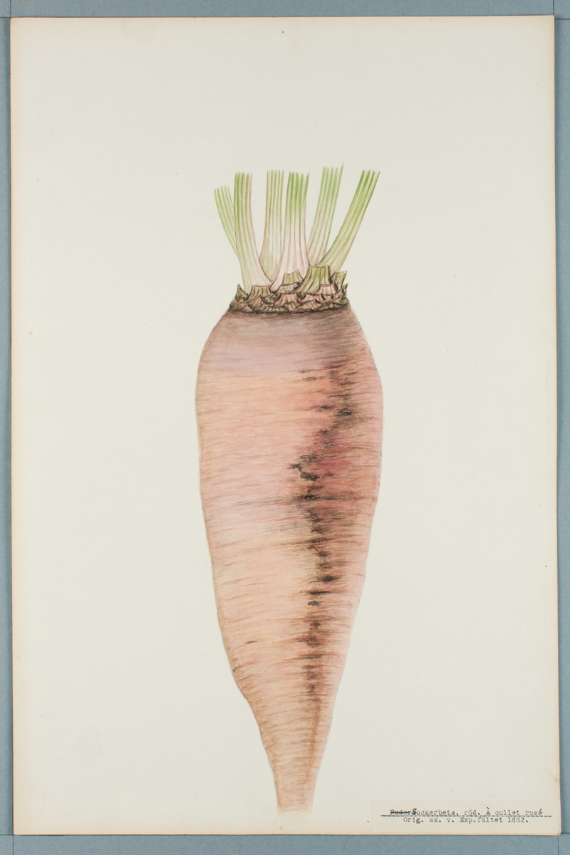 Sveriges kulturväxter. Illustration utförd av Henriette Sjöberg. Sockerbeta, röd, À Collet rosé. Odlad Experimentalfältet 1882. Inv. nr. C101 : 251. Signerad "H.S. 1883.".