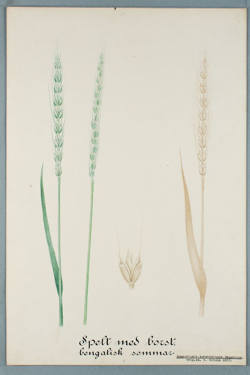 Sveriges kulturväxter. Illustration utförd av Henriette Sjöberg. Vete, Spelt, Sommarspelt, borstbärande, bengalisk. Odlat Ultuna 1872. Inv. nr. C101 : 139.