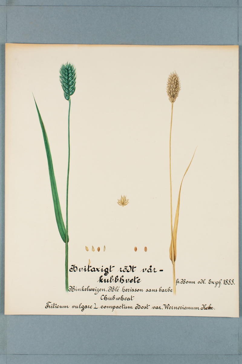 Sveriges kulturväxter. Illustration utförd av Henriette Sjöberg. Vete, Vårkubbvete, vitaxigt, rött från Bonn. Odlat Experimentalfältet 1888.