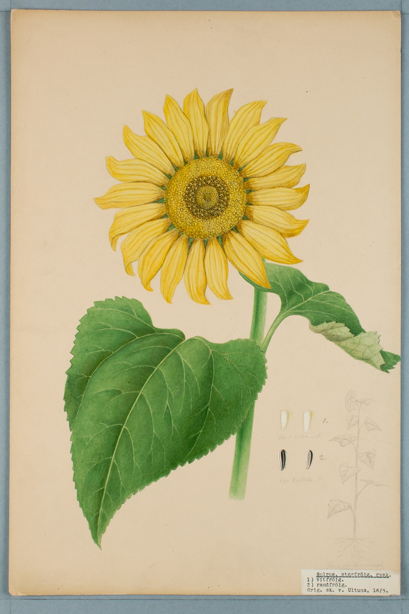 Sveriges kulturväxter. Illustration utförd av Henriette Sjöberg. Solros, storfröig rysk, a. vitfröig b. randfröig. Odlad Ultuna 1875. Inv. nr. C101 : 238. Jämför NMA.0098176.